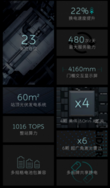 蔚來第四代換電站搭載 4 顆英偉達 Orin X 芯片,配備 6 顆超廣角激光雷達,整站算力 1016 TOPS;兼容多規(guī)格電池包,支持多品牌共享換電