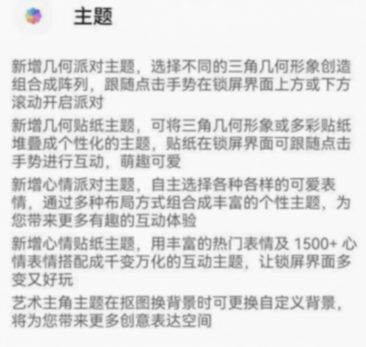 這次更新新增了幾何派對、幾何貼紙、心情派對、心情貼紙四大互動主題,為用戶帶來前所未有的視覺盛宴,幾何貼紙中用戶可將多個三角幾何形象堆疊成個性主題,這些貼紙可在鎖屏界面跟隨點擊手勢進行互動。