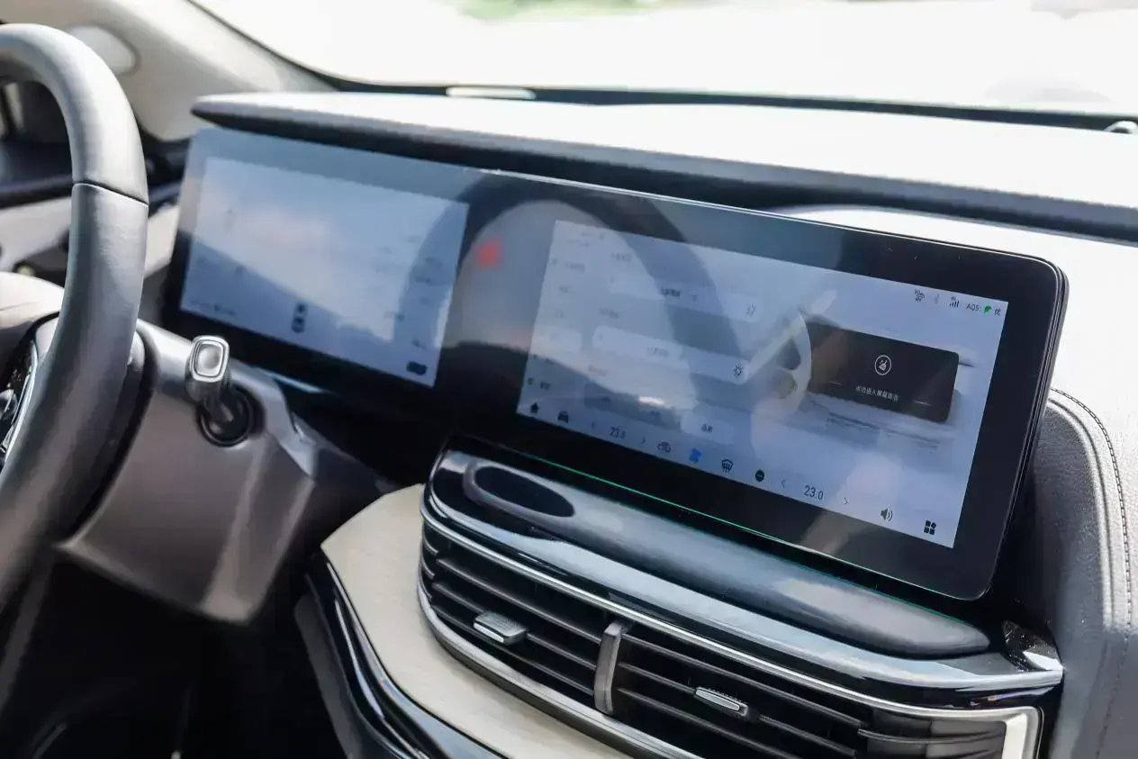 步入舒享家車內,雙拼色的座艙配色營造出溫馨的氛圍。雙12.3英寸的連體大屏基本將所有的車載功能囊括其中,換擋機構采用懷擋設計,中央扶手處除常規的儲物空間與杯托外,還支持50W的手機無線快充功能。中控區域并沒有過分的設計,僅保留空調出風口與木紋裝飾面板。