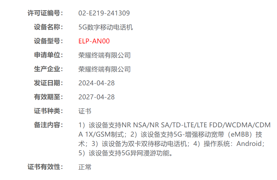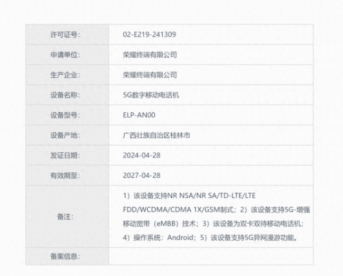 日前,有一款型號為ELP-AN00的榮耀新機在工信部完成入網并通過無線電核準,預計為榮耀200系列。