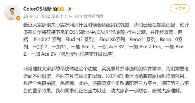 根據馬新發布的內容,此次「實況照片」要覆蓋的機型非常多,具體有:Find X7 系列、Find N3 系列、 Find X6系列、Reno11系列、Reno 10系列、一加12、一加11、一加 Ace 3、一加 Ace 3V、一加 Ace 2 Pro、一加 Ace 2、一加 Ace 2V(機型羅列排序非升級順序)。