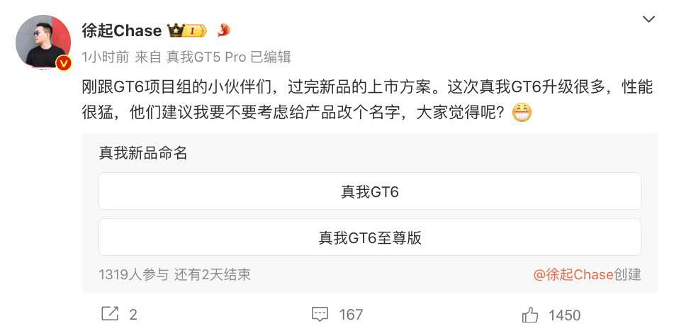 至于官方方面,徐起也在微博中對新機進行了一定的信息透露,直言真我GT6此次“升級很多,性能很猛”,并且也是發起了新品征名活動,選項中就包含有“真我GT6至尊版”的選項。通過這樣的命名方式,我們也能明顯看得出這款真我新機的突出升級效果,實力水準向著市面上的“至尊版”機型所看齊,這也很符合品牌本身的越級調性了。