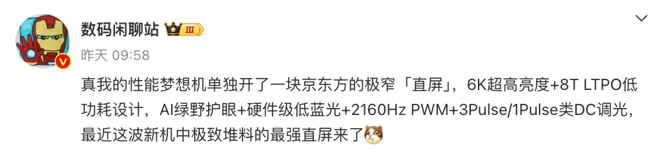 譬如在“真我性能夢想機”的屏幕方面,站哥就透露這是品牌單獨為新機開的一塊京東方的極窄「直屏」,擁有著6K超高亮度以及8T LTPO低功耗設計,護眼性能上甚至是集齊了AI綠野護眼、件級低藍光、2160Hz PWM+3Pulse/1Pulse類DC調光等黑科技,無論是視覺效果或是實用性方面都表現突出,稱之為“極致堆料的最強直屏”也一點不為過。