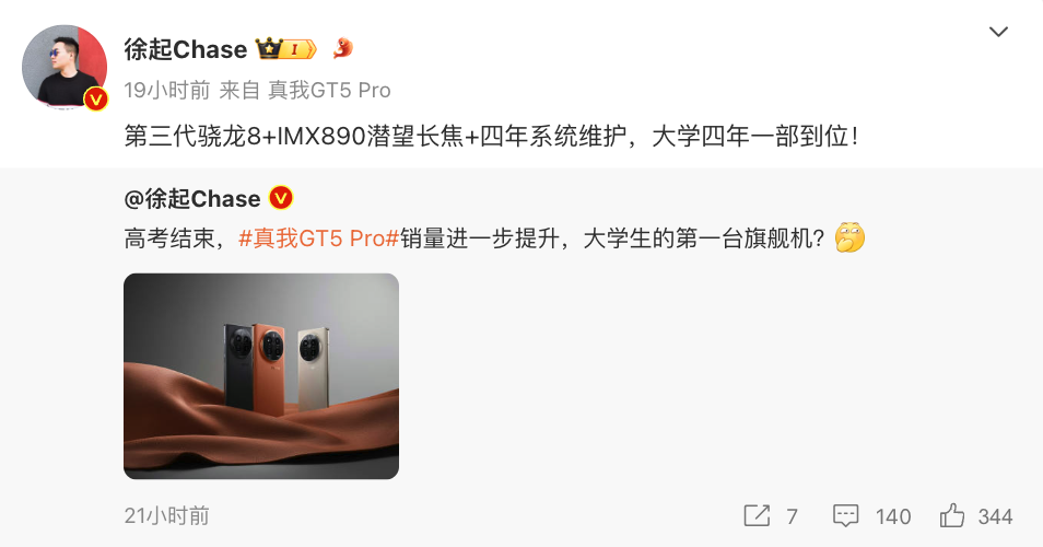 更何況,品牌總裁徐起也在個人微博中透露,在高考結束之后,品牌當家旗艦真我GT5 Pro還將會迎來銷量方面的進一步提升,有著足夠的資格成為大學生第一臺旗艦機。說實話,當目前不到3000元的活動到手價下,真我GT5 Pro能給到最新驍龍8 Gen3處理器和超強散熱、4500nits峰值亮度的無雙屏、IMX890潛望長焦、5400mAh電池+100W有線充電+50W無線充電、豐富AI實用工具等等旗艦級別體驗,整體性價比對于廣大學生黨來說著實很有吸引力。