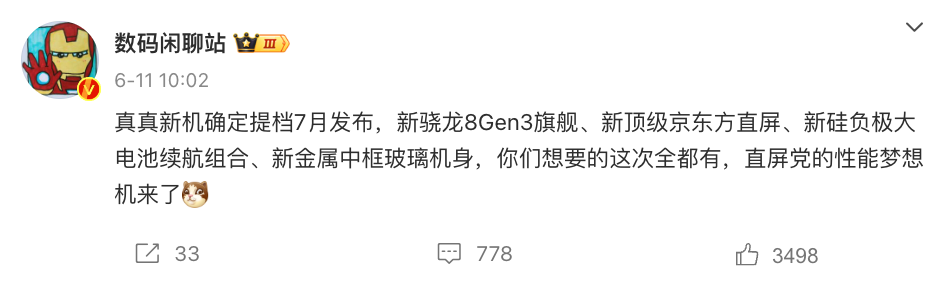 在目前真我GT5 Pro的表現已經足夠亮眼的情況下,realme真我或還將為大家帶來更值得期待的實力新機。據知名數碼爆料博主“數碼閑聊站”的消息顯示,真我即將在7月份迎來一款新驍龍8 Gen3旗艦手機,并且直言會采用“新頂級京東方直屏、新硅負極大電池續航組合、新金屬中框玻璃機身”這些關鍵特征,從質感、屏幕、性能再到續航方面給到了各種讓人滿足的方案,因此也被看做是“直屏黨的性能夢想機”。