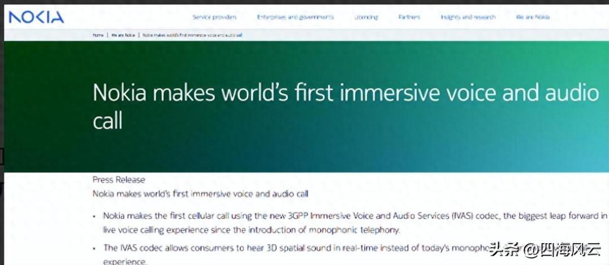近期,諾基亞成功完成了全球首個基于蜂窩網絡的實時沉浸式語音和視頻通話測試,這項被命名為IVAS(沉浸式語音和音頻服務)的技術,基于最新的3GPP第18版標準,為我們展現了未來通信的無限可能