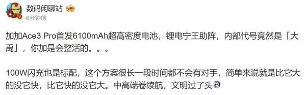 近日,有博主表示,一加Ace3 Pro首發6100mAh超高密度電池,有鋰電寧王助陣,內部代號是「大禹」。同時該機的100W閃充也是標配,這個方案很長一段時間都不會有對手,簡單來說就是比它大的沒它快,比它快的沒它大。