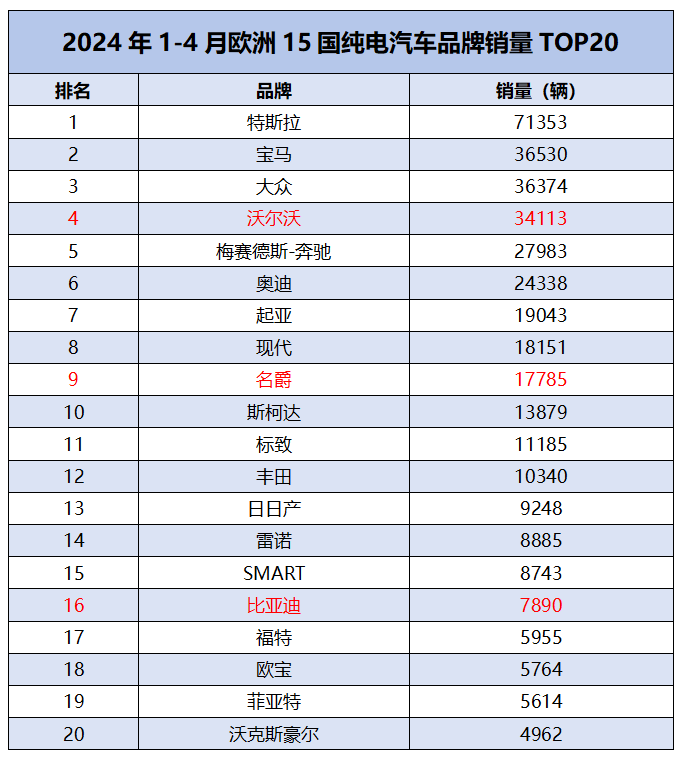 今年1-4月歐洲15國純電汽車品牌銷量榜上,共有3個中國品牌或歸屬于中國制造商的品牌進入TOP 20,它們分別是沃爾沃、名爵、比亞迪。沃爾沃雖然是歐洲本土品牌,但它被吉利汽車收購后已完全受吉利控股,因此被打上“中國”標簽。