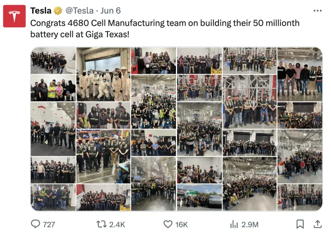 目前,德克薩斯工廠迎來(lái)了一個(gè)重要的里程碑,生產(chǎn)出了第5000萬(wàn)個(gè)4680型電池(4.5GWh)。與2023年10月11日生產(chǎn)的第2000萬(wàn)個(gè)電池相比,生產(chǎn)速度有所改進(jìn),近238天的時(shí)間里,平均每天生產(chǎn)126,050個(gè)電池。