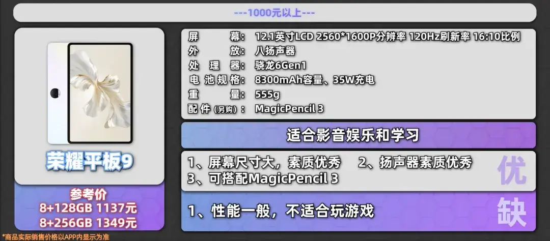 首先是榮耀平板 9,現在 1150 元左右就可以買到 8+128GB 的版本了,擁有一塊 12.1 英寸的大屏幕和素質不錯的八揚聲器,千把塊錢買來刷劇很香。