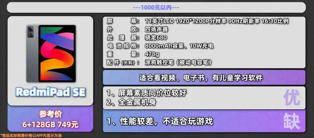 在千元以內價位,依舊是那個熟悉的身影 RedmiPad SE,主要是這個價位段并沒有什么值得買的新品更新。
