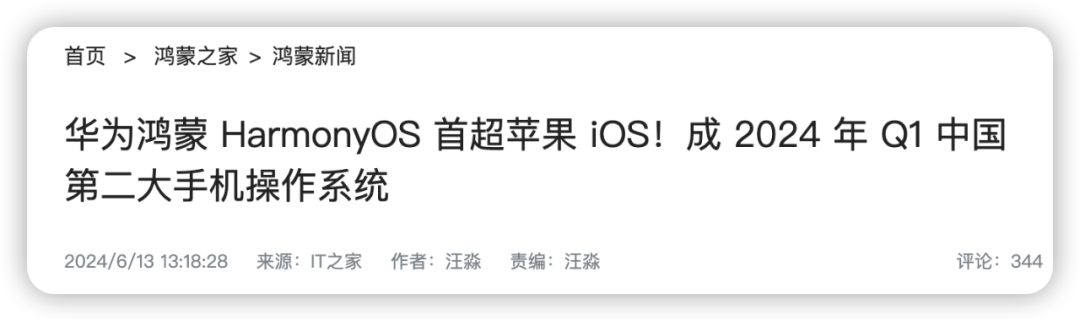 數據顯示,2024 年第一季度,華為鴻蒙 HarmonyOS 在中國市場份額首次超越了蘋果 iOS。