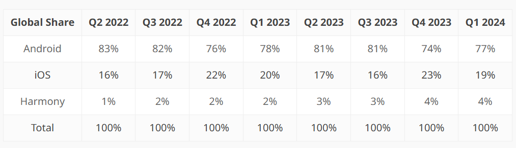華為鴻蒙系統的全球份額,則由此前的 2% 翻了一番、來到了 4%。