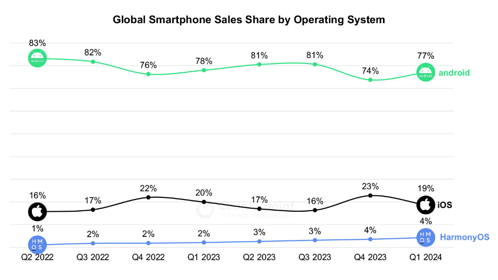 報告顯示,華為鴻蒙 HarmonyOS 在中國市場的份額,由 2023 年一季度的 8% 上漲至 2024 年一季度的 17%。