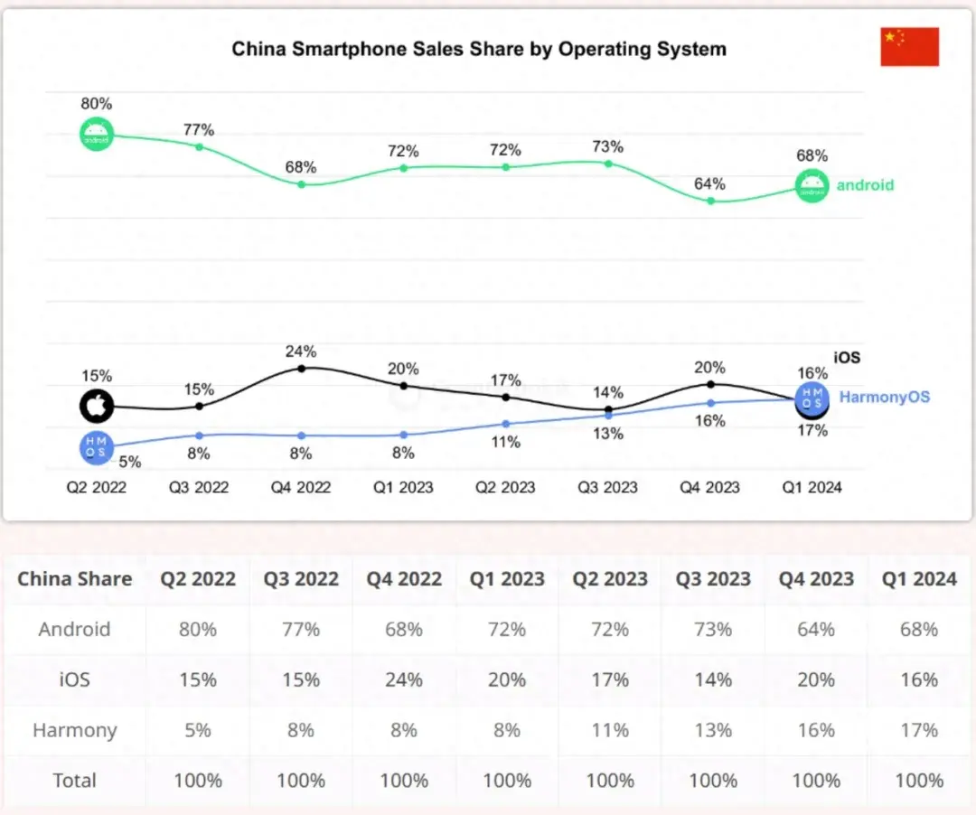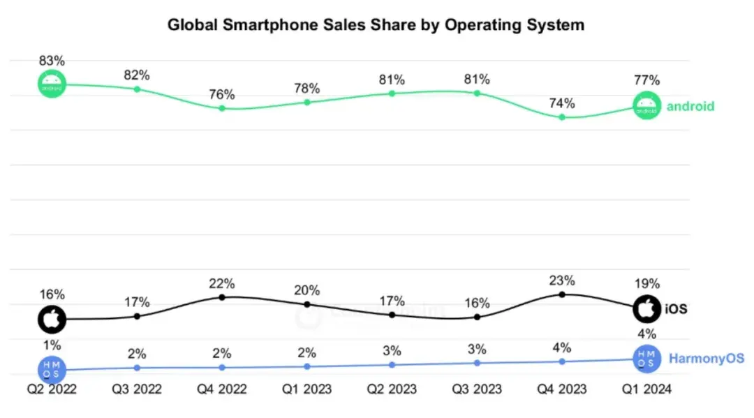 近日市場調研機構Counterpoint發布最新報告表示,2024年Q1,華為鴻蒙HarmonyOS在中國手機市場,首次超越了蘋果的iOS。這也就意味著,HarmonyOS已經成為中國第二大操作系統了。