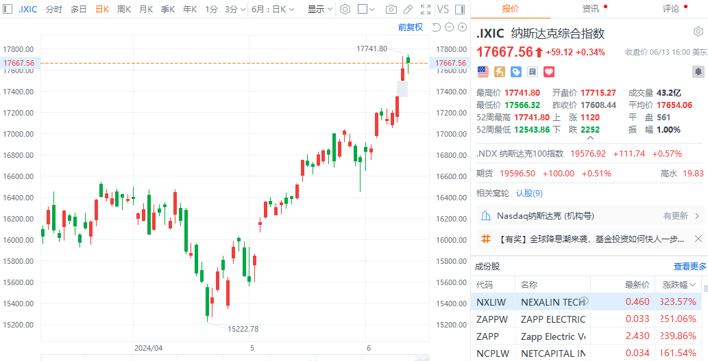 納指、標(biāo)普500指數(shù)均連續(xù)四個(gè)交易日續(xù)創(chuàng)歷史收盤新高 蘋果收盤總市值超越微軟】財(cái)聯(lián)社6月14日電,美股三大指數(shù)收盤漲跌不一,納指漲0.34%,標(biāo)普500指數(shù)漲0.23%,道指跌0.17%。其中,納指、標(biāo)普500指數(shù)均連續(xù)四個(gè)交易日續(xù)創(chuàng)歷史收盤新高。大型科技股互有漲跌,英偉達(dá)漲超3%,特斯拉漲超2%,蘋果、微軟、奈飛小幅上漲;亞馬遜、谷歌跌超1%,Meta小幅下跌。其中,蘋果收盤總市值3.29萬(wàn)億美元,超越微軟公司的3.28萬(wàn)億美元,重奪美股第一寶座。蘋果、英偉達(dá)、微軟均續(xù)創(chuàng)收盤新高。