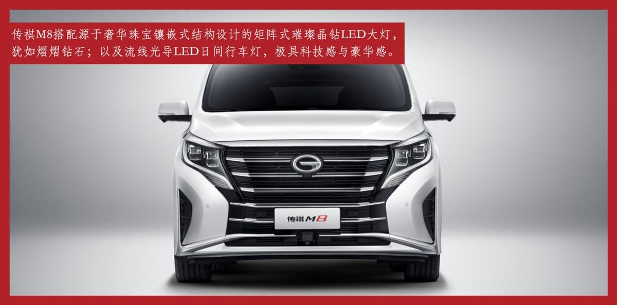 傳祺M8是中國豪華商務MPV的創領者,外觀設計威嚴大氣,前臉采用橫向貫穿式凌云翼3.0鍍鉻前格柵設計,造型霸氣、氣場更強、威嚴于表。并搭配源于奢華珠寶鑲嵌式結構設計的矩陣式璀璨晶鉆LED大燈,猶如熠熠鉆石;以及流線光導LED日間行車燈,極具科技感與豪華感。
