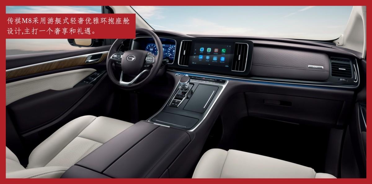 在座艙方面,傳祺M8采用游艇式輕奢優雅環抱座艙設計,主打一個奢享和禮遇。搭配瀑布式console中控臺,采用真皮覆蓋,中央懸浮設計,可帶來更大前排空間,操作與實用性兼得。搭配造型精致,晶瑩剔透,質感出眾的奢雅精致電子換擋桿,以及電動全景天窗和三區獨立控制自動恒溫空調。