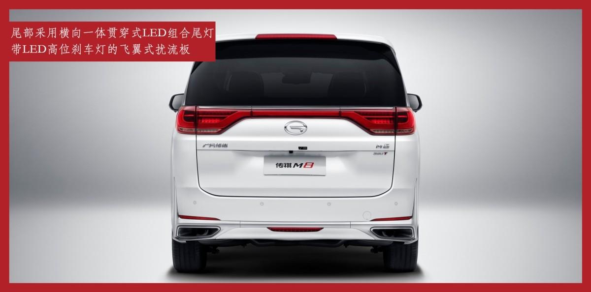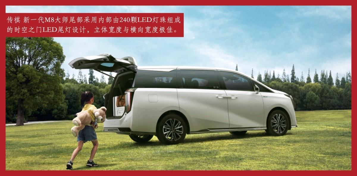 車身側面,傳祺 新一代M8大師線條筆直流暢,從車對一直貫穿至車尾,展現出修長且大氣的車身輪廓。尾部采用內部由240顆LED燈珠組成的時空之門LED尾燈設計,呈現出貫穿樣式,整個尾部相對垂直,立體寬度與橫向寬度極佳。
