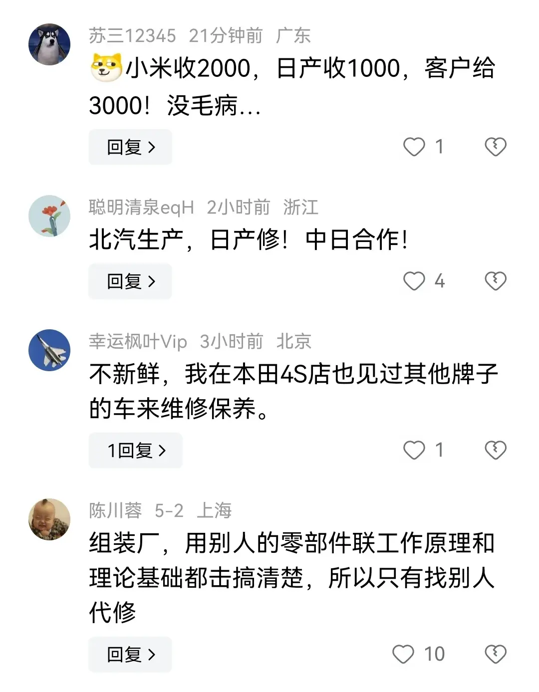 還有網(wǎng)友問(wèn),為什么不去國(guó)產(chǎn)汽車的 4S 維修店呢,難道去國(guó)產(chǎn)的4s店丟人嗎?有些不服去的米粉反問(wèn)說(shuō),問(wèn)界為什么不在華為的用戶中心維修,網(wǎng)友回答說(shuō):?jiǎn)柦缭?/span>賽力斯用戶中心,智界在奇瑞4s店,反正不在日產(chǎn),被網(wǎng)友懟的無(wú)語(yǔ)以對(duì)。