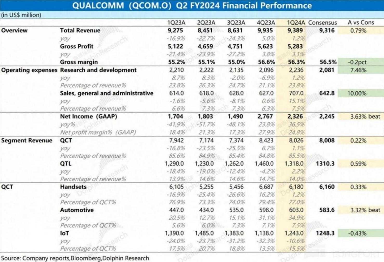 1、整體業(yè)績: 中規(guī)中矩。高通在 2024 財(cái)年第二季度(即 24Q1)實(shí)現(xiàn)營收 93.89 億美元,同比增長 1.2%,基本符合市場預(yù)期(93.16 億美元)。公司本季收入增速再次回落,主要是受智能手機(jī)業(yè)務(wù)的影響;公司在本季度實(shí)現(xiàn)凈利潤 23.26 億美元,同比增長 36.5%,好于市場預(yù)期(22.45 億美元),增長主要來自于非經(jīng)營面的影響。