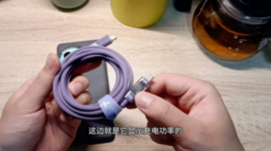 這是一根可以顯示充電功率的數據線,這邊就是顯示充電功率的LED屏。這一根充電線最高是支持PD100瓦的充電協議,這邊有一個100瓦的標識,它是雙typec的接口,所以這個充電器比較適合電腦的充電器使用或者typec接口的手機充電器使用。