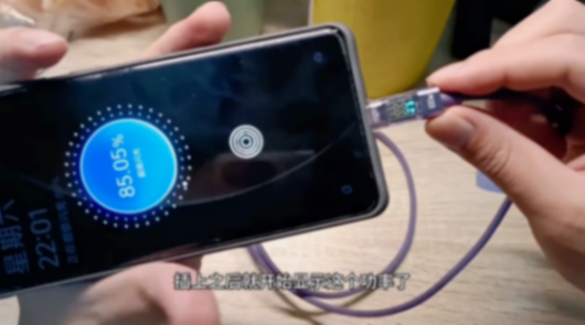 剛好這一臺1加ace2Pro的充電器就是typec接口的,而且這一臺手機宣稱的PD充電協議是45瓦,試一下用這個數據線充電到底能不能充到45瓦。現在手機的電量還剩下85%,看一下能不能激活45瓦PD快充。插上之后就開始顯示功率了,直接到35瓦,36瓦,現在是46瓦,PD46瓦。