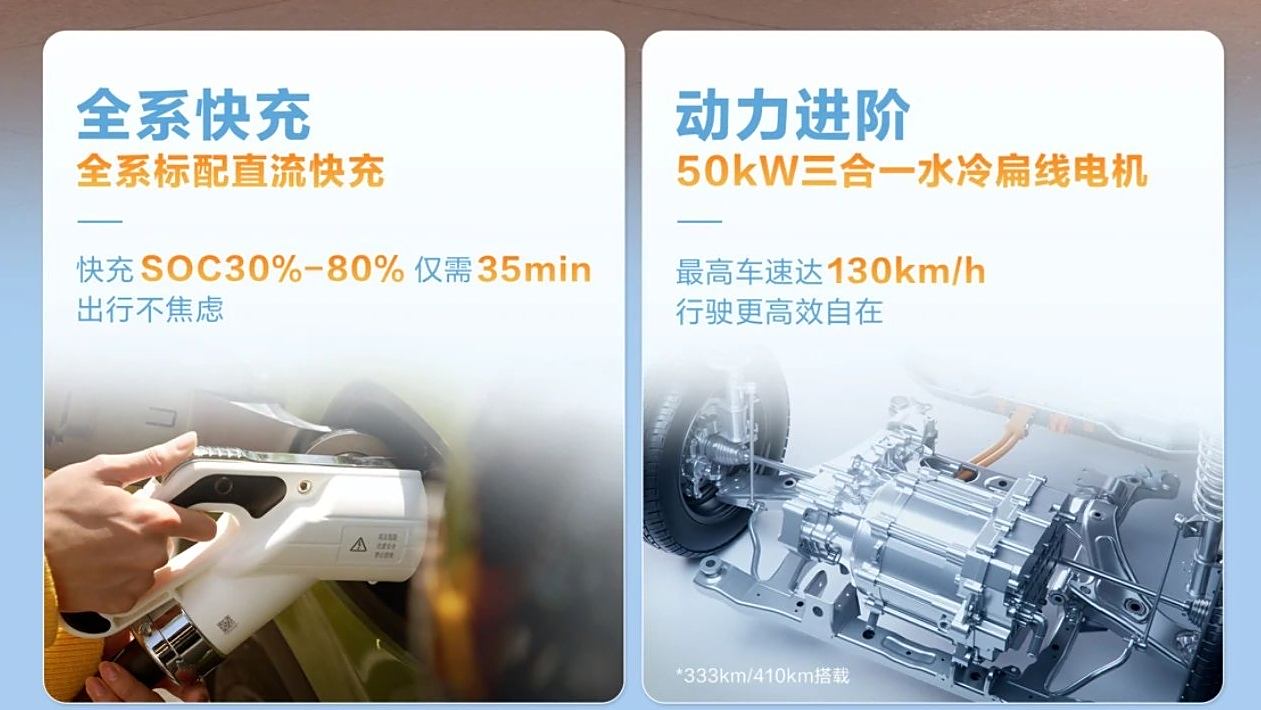 動力方面,新車在333km和410km兩款續(xù)航版本車型上,升級了水冷扁線電機(jī),具有更好的散熱能力,最大馬力為68匹,車輛的極速提升至130km/h;203km續(xù)航車型依舊搭載了41馬力的單電機(jī),最高車速為100km/h。
