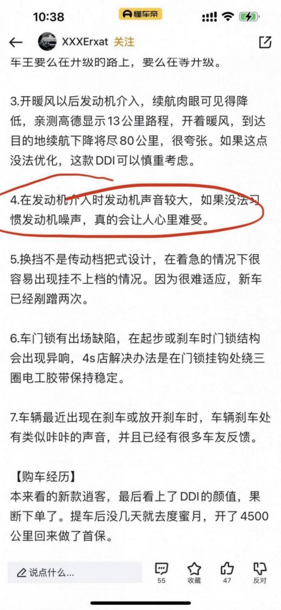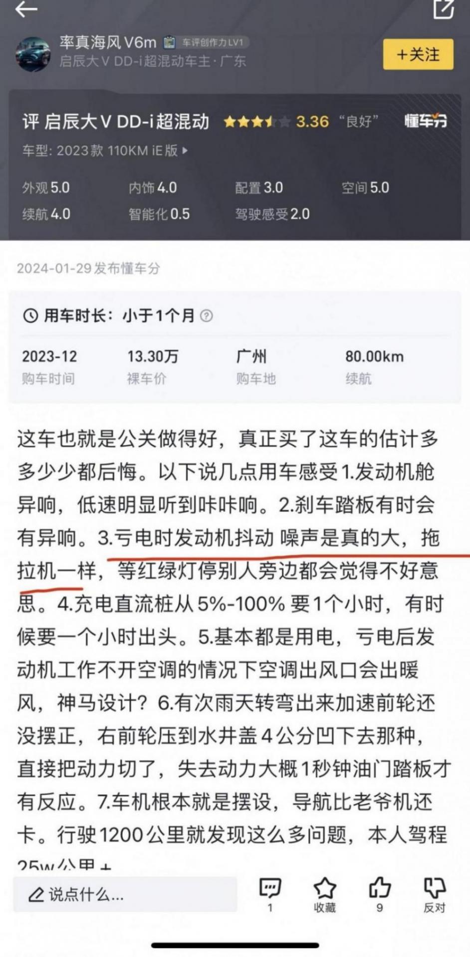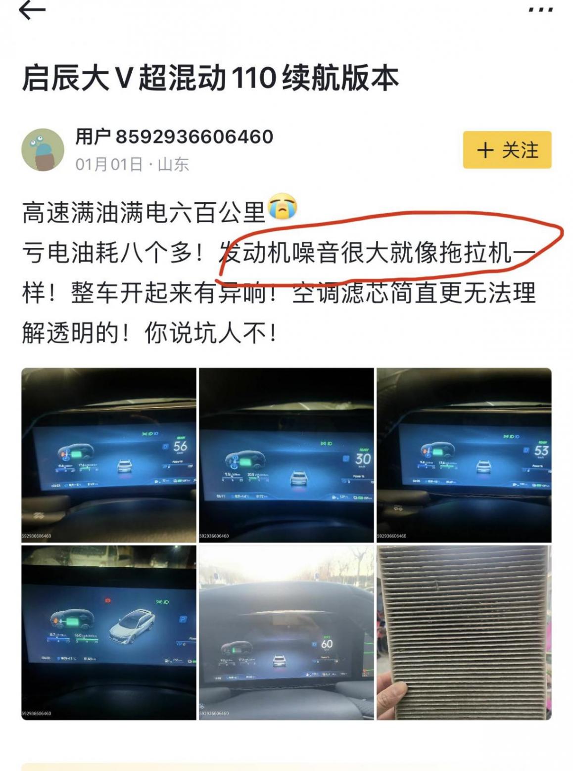 首先是發動機噪音特別大,特別是在虧電的時候,要知道啟辰大V DD-i兩個續航版本,一個純電續航60km,一個純電續航110km,對于買低配車型的朋友來說,虧電行駛是常態。而虧電的時候,發動機會一邊給電池充電,一邊給車輪提供動力,因此發動機負荷增加,所以噪音大。