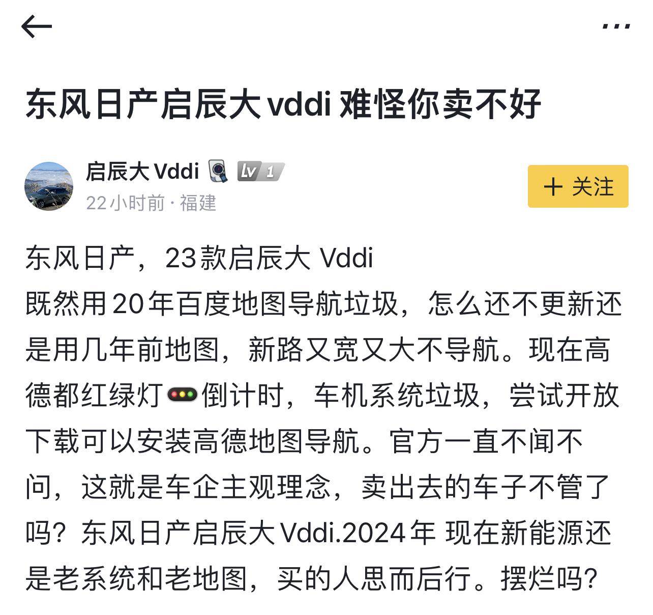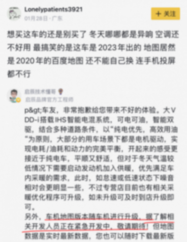 然后一位自稱是啟辰品牌官方工程師的人在回復用戶抱怨的時候也說:“車機地圖版本隨車機進行升級,據了解相關開發人員正在緊急開發中,敬請期待。”