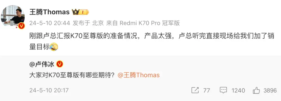 值得一提的是,上個月小米盧偉冰和Redmi負責人王騰還在微博互動,王騰稱“(K70至尊版)產品太強,盧總聽完直接現場給加了銷量目標”。就曝光的這些配置,大家看好K70至尊版的表現嗎?