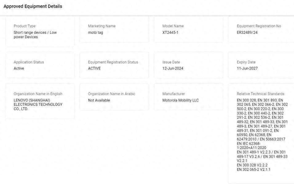 6 月 15 日消息,摩托羅拉要在“物品追蹤器”發力了,該產品名稱為 Moto Tag,目前已經現身阿聯酋電信和數字政府監管局(TDRA),型號為 XT2445-1。