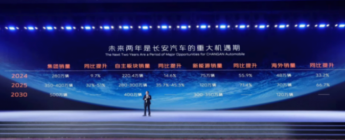 根據長安汽車最新的銷量規劃,2025年,長安汽車集團將完成350萬-400萬輛的銷量目標,其中包含新能源車120萬輛;2030年,集團力爭實現年銷500萬輛目標,新能源車300-350萬輛,長安啟源單一品牌將承擔其中的150萬輛。新能源車滲透率超過60%,這可以視作全面電動的開始。