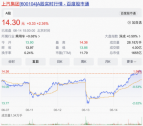 6月13日,上汽集團股價一度下滑3%來到13.7元,接近歷史低點。上汽也選擇在此時開展了大范圍的回購計劃。