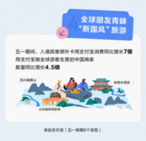 其中,伴隨免簽政策的推出,入境游持續升溫,全球游客入境支付也更加便捷。五一期間,入境賓客綁定外卡用支付寶消費同比增長7倍;商家也迎來了新商機,用支付寶做全球游客生意的中國商家數量同比增長4.5倍。