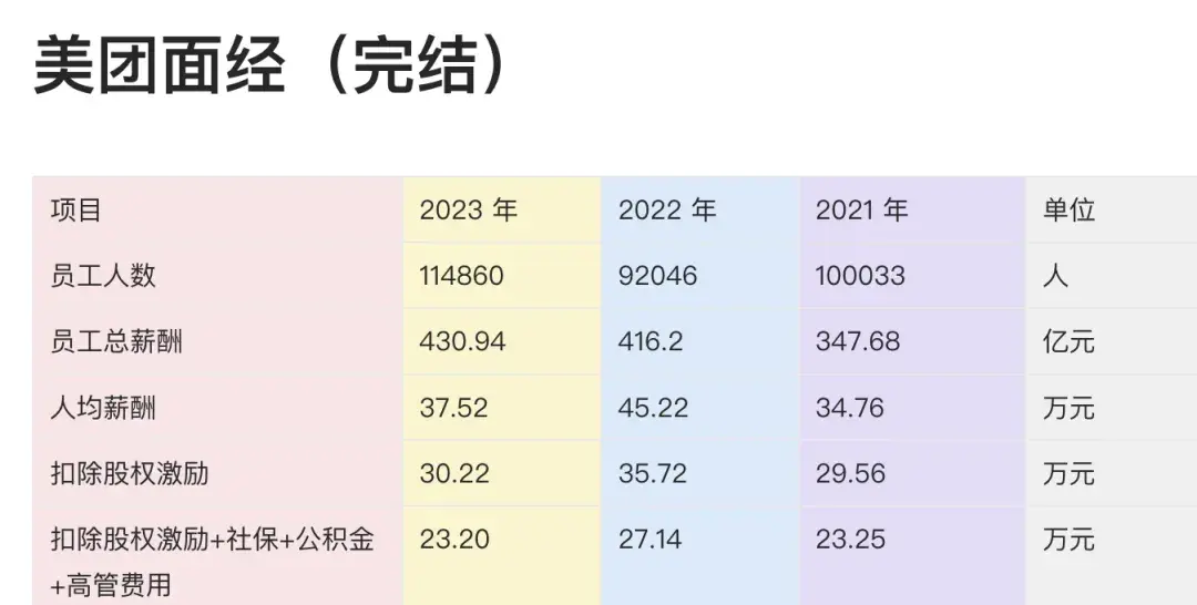 ③、如果不帶股權(quán)、社保、公積金、高管費(fèi)用的話,2023 年美團(tuán)的人均薪酬是 23.20 萬人民幣。這個(gè)收入也是超越大部分人的。