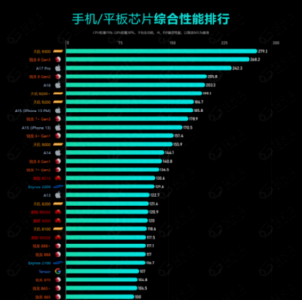 從圖中可以看到,排在前三的分別是天璣9300、驍龍8Gen 3和蘋果A17 pro,其中兩款安卓頂尖處理器居然超過了蘋果,這是以前很難看到的,因為蘋果A系列芯片有著很強的設計能力,性能實力幾乎超過安卓兩代,每次排名也都是蘋果的芯片排在前列,這次驍龍和天璣處理器卻排在前列,尤其是天璣9300,這款處理器居然這么厲害。