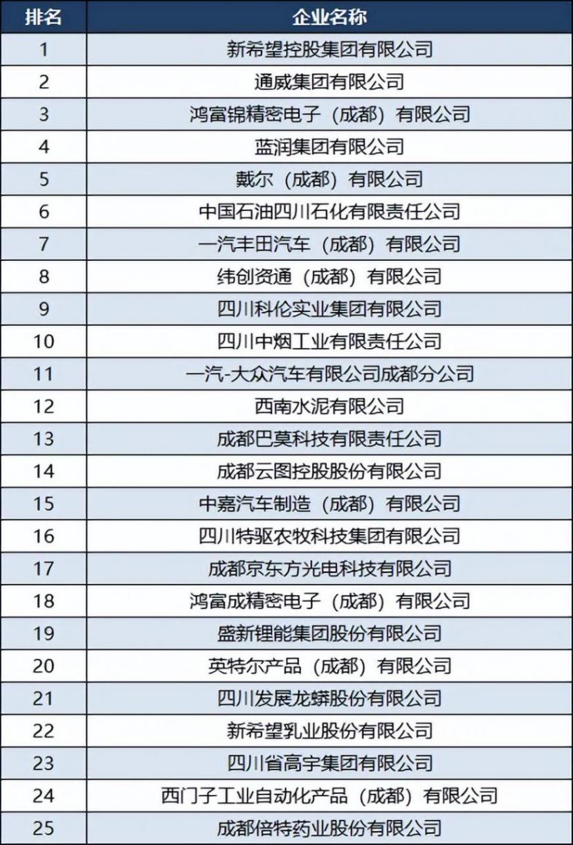 根據2023年末成都企業聯合會發布的“2023成都制造業企業100強名單”,成都排名前十的制造業企業為:新希望控股集團、通威集團有限公司、鴻富錦精密電子(成都)、藍潤集團、戴爾(成都)有限公司、中國石油四川石化、一汽豐田汽車(成都)、緯創資通(成都)、四川科倫實業集團、四川中煙工業。