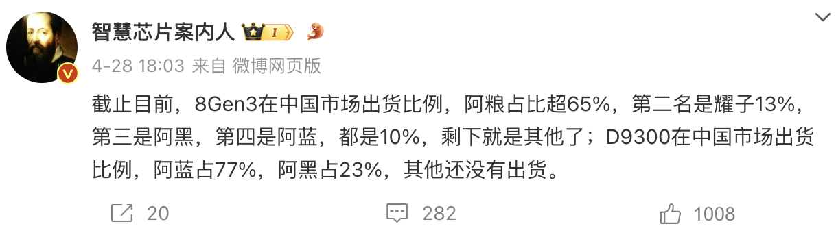 處理器價(jià)格上漲,意味著手機(jī)廠商的生產(chǎn)成本將進(jìn)一步提高。今年4月,有博主曝光了驍龍8 Gen3在中國市場(chǎng)的出貨比例,截至曝光日期,小米占比超65%,成為驍龍8 Gen3在國內(nèi)最大的買方。不過,這里的“小米”應(yīng)該包括小米和Redmi兩大品牌;排名第二的是榮耀,占比13%;排名第三、四名分別為OPPO和vivo,占比都是10%,當(dāng)然其中各自包含了旗下各子品牌。