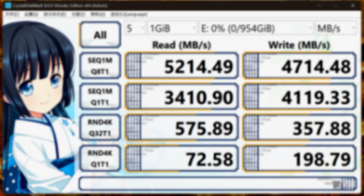 我們使用了CrystalDiskMark進行了跑分,其中讀取速度為5214.49MB/s,寫入速度為4714.48MB/s。相較于其包裝盒子背面的數據,均有超出。看來老牌大廠的固態,不夸張參數,性能也更有保障。