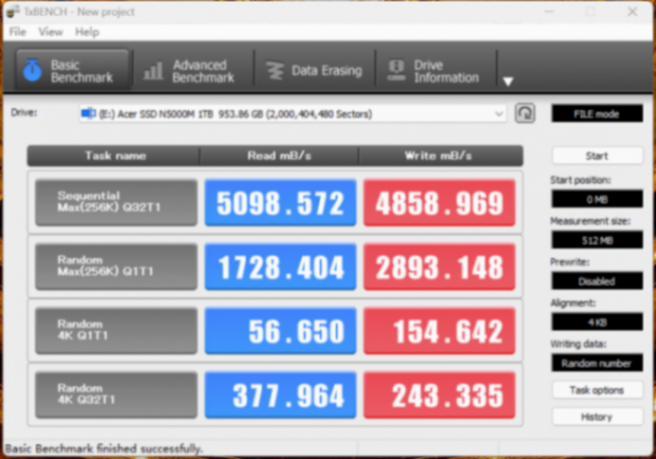 另外,我們也使用了TxBENCH進行了測試,它的讀取為5098.572,寫入為4858.969。比CDM讀取慢了一丟丟,寫入快了一丟丟。當然,這個和軟件的算法有關,但也從另外一個維度說明了,宏碁N5000M 2230確實性能不錯。