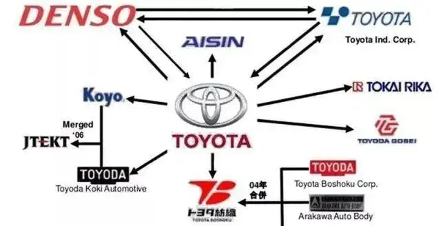 豐田汽車(chē)在日本有著完整的產(chǎn)業(yè)鏈,與它輔車(chē)相依的企業(yè)包括株式電裝、愛(ài)信精機(jī)、豐田通商、愛(ài)知制鋼、豐田車(chē)體、豐田紡織、豐田合成等等。