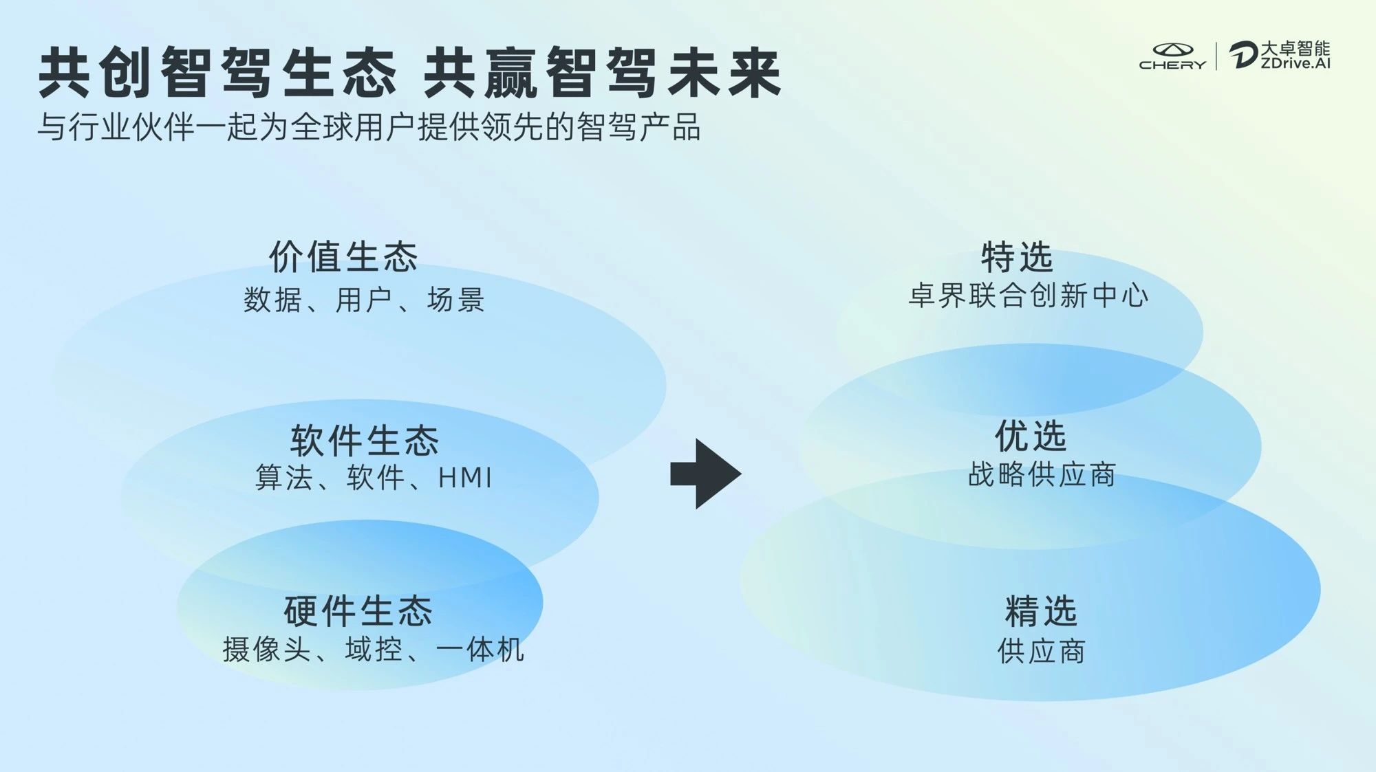 發布會上,大卓智能宣布,和博世、地平線、科大訊飛、立訊精密、四維圖新,成立“卓界聯合創新中心”。這是繼年初“大卓智能生態創新聯盟”成立后,大卓智能錨定全面產業化目標,積極進行生態圈建設的又一關鍵舉措。從自主開發到核心自研、全棧可控,大卓協同核心伙伴,打造從產品到技術開發,到量產交付再到數據運營的全價值鏈條,為奇瑞智能化的新征程提供強有力的動力支撐。