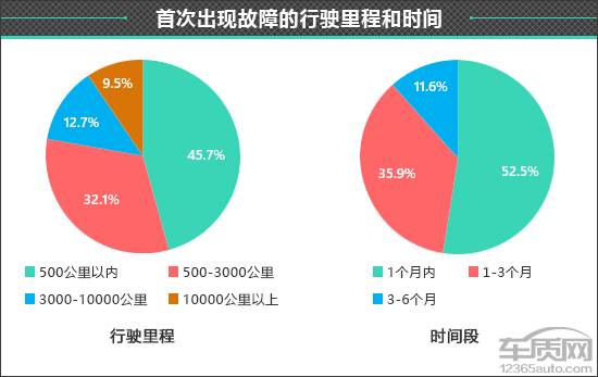 在這些出現非人為故障的車輛中,首次故障出現在行駛里程500公里以內的占比最高,為45.7%;其次是行駛里程在500-3000公里出現故障的車輛,占比為32.1%。而對于首次出現故障時間段的調查結果顯示,對于大多數受訪車主而言,車輛首次故障均出現在購車1個月內,占比為52.5%。
