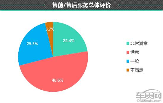 不過,在售前/售后服務總體評價中,接受調查的車主還是給出了客觀的評價,其中認為“非常滿意”的車主占比為22.4%;認為“滿意”的車主占比為48.6%;認為“一般”的車主占比為25.3%;明確表示“不滿意”的車主占比為3.7%。