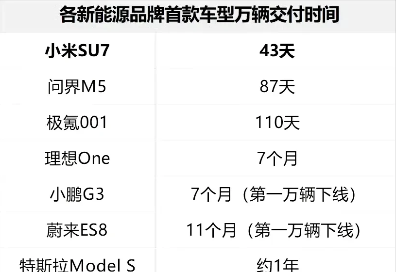 對比其它友商,大家就會明白,這個43天交付1萬輛的含金量有多高了,在小米SU7之前,最快的華為問界M5,也花了87天才交付1萬輛,其它品牌,更是長達好幾個月的。