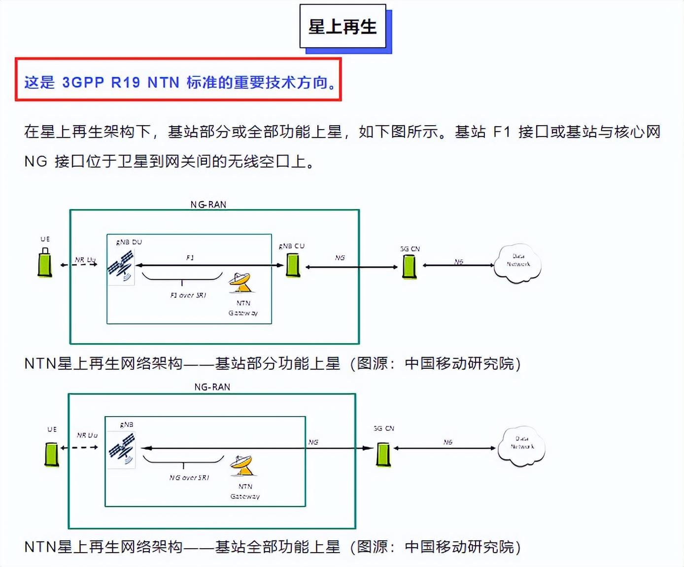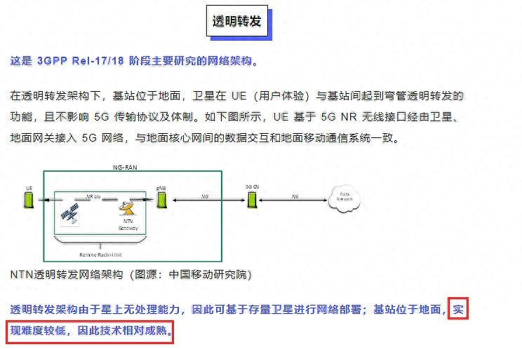 而在 3GPP NTN 項目中,根據衛星星上載荷能力,網絡架構可以分為【透明轉發】和【星上再生】兩種典型模式: