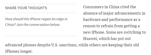 評論認為,硬件和性能缺乏重大進步是中國消費者不購買新iPhone的重要理由。一些用戶,延長了舊iPhone的使用壽命,不再購買蘋果新產品。與此同時,盡管受到美國的制裁,但華為等品牌仍推出了功能先進的手機,一些用戶轉而使用國產手機。