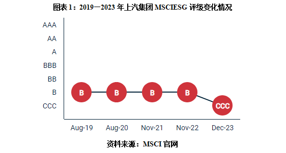 早在2019年,上汽集團(tuán)便被MSCI納入其ESG評估名單。MSCI官網(wǎng)顯示,2019—2022年,上汽集團(tuán)的ESG評級均為B級;2023年12月,該公司ESG評級被下調(diào)至CCC級。