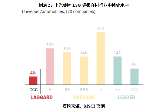 從評級分布看,在全球70家汽車制造公司中,處于AAA級或AA級等領(lǐng)先水平的比例合計為22%;處于A級、BBB級、BB級等一般水平的比例合計為56%;處于落后水平的企業(yè)中,評級為B的比例為18%,與上汽集團(tuán)同屬CCC級的比例為4%。以70家公司的總數(shù)計算,可知上汽集團(tuán)的ESG評級在該行業(yè)中位居倒數(shù)前三。